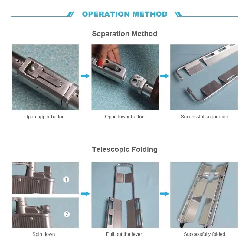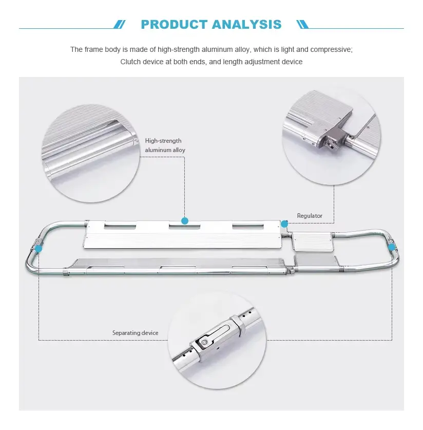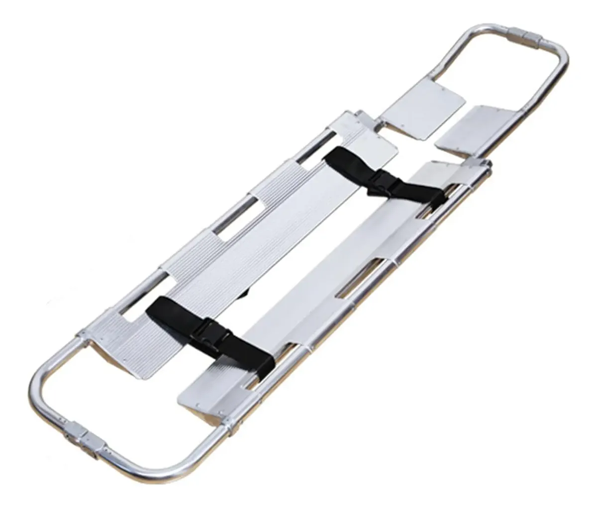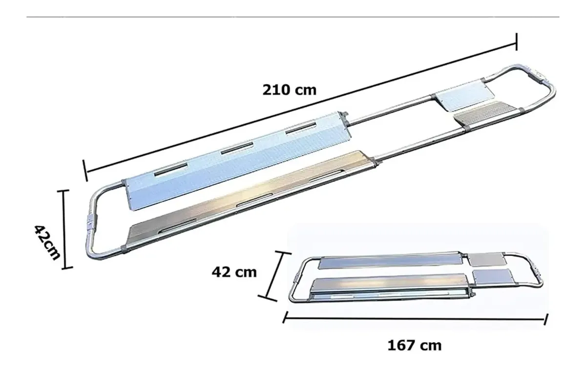 Tabla para inmovilización cervical tipo scoop – cuchara, fabricada en aluminio, ideal para ambulancias, campos deportivos, hospitales, etc, para inmovilización de pacientes con lesiones cervicales o espinales, la tabla se puede separar en dos para levantar al paciente, viene con correas de sujeción de paciente, peso de 8 kg, capacidad de carga de 159 kgs, se puede acomodar al tamaño del cuerpo.